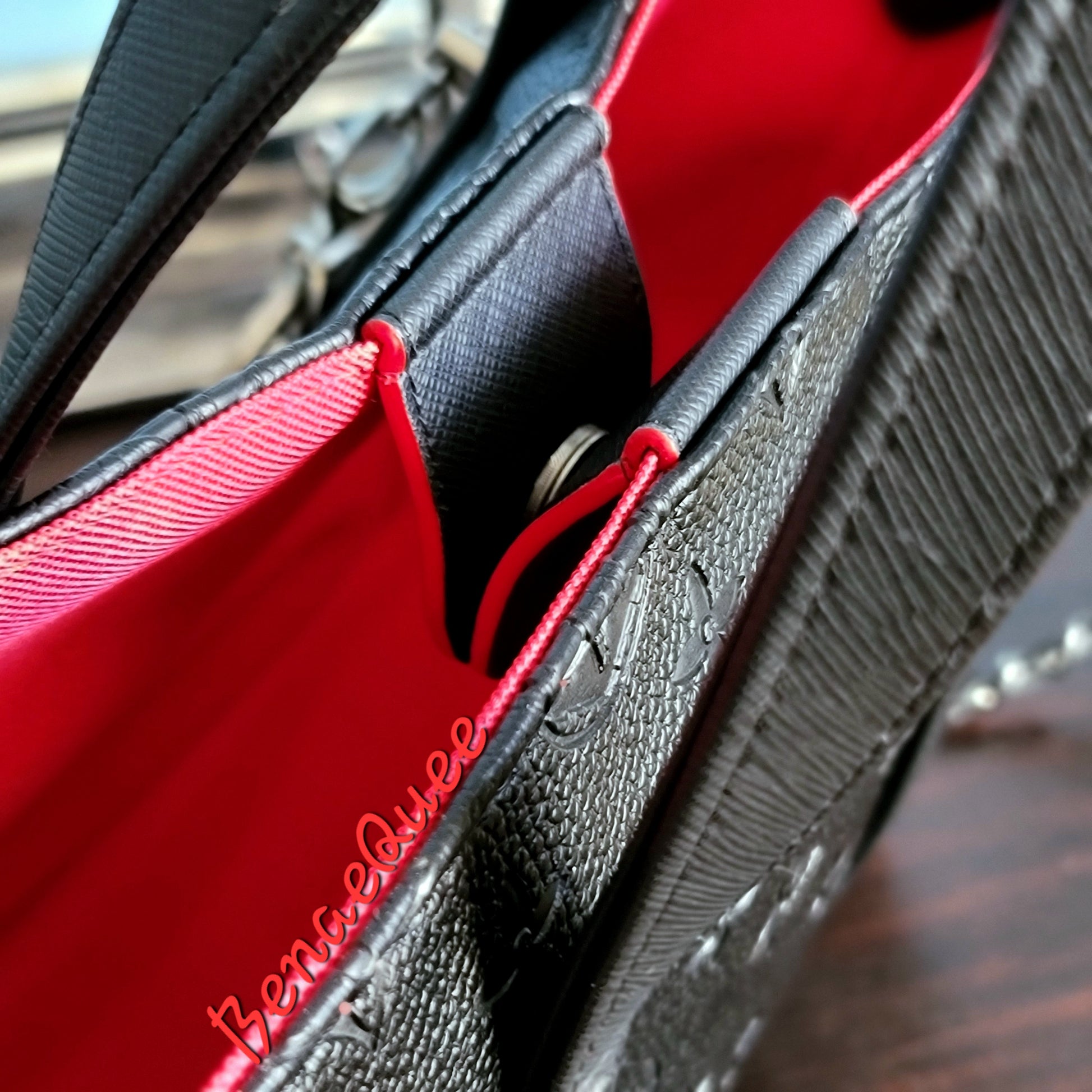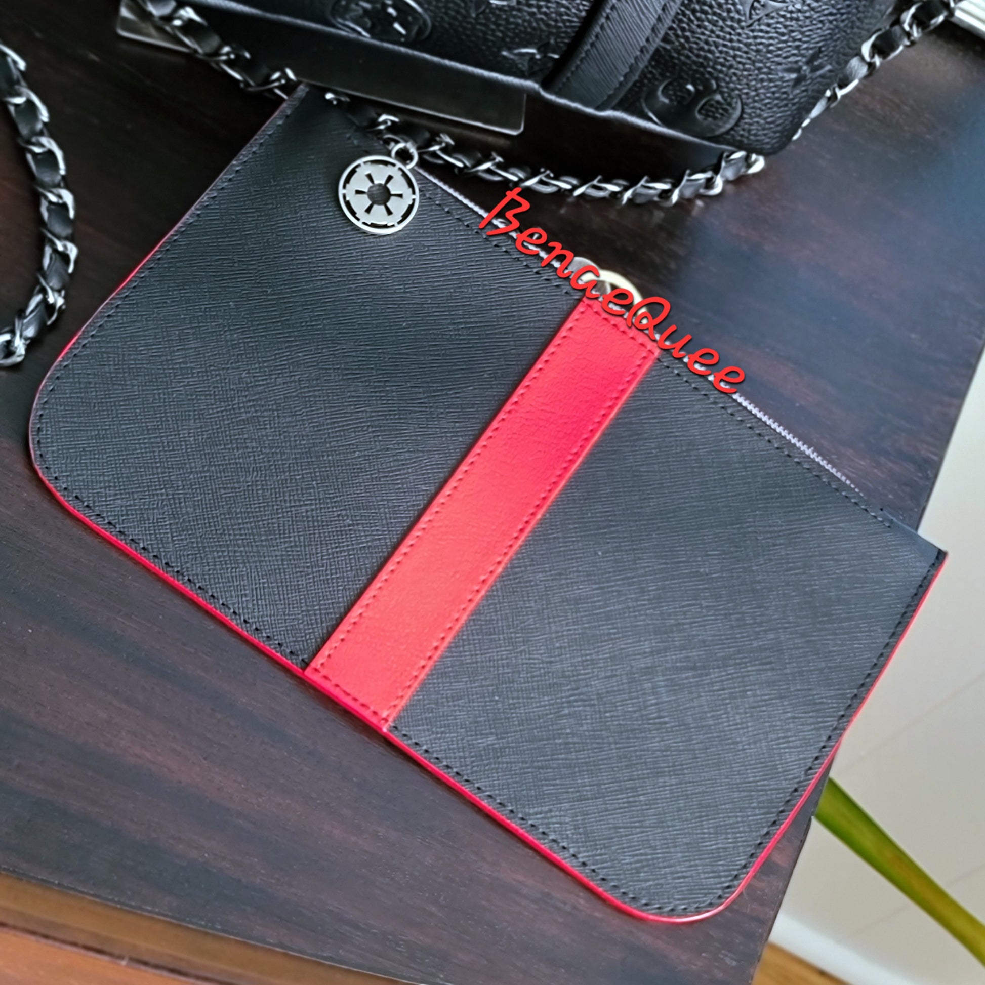 The interior of the bag is roomy enough for all of your essentials and includes a slip pocket for your phone. I love this nice open style, because I frequently use zipper bags to organize my purses and just toss them from bag to bag easily. To make your life just as easy, there is even a matching zipper pouch for you! The bag lined in a red waterproof vinyl for the sithly pop of color.