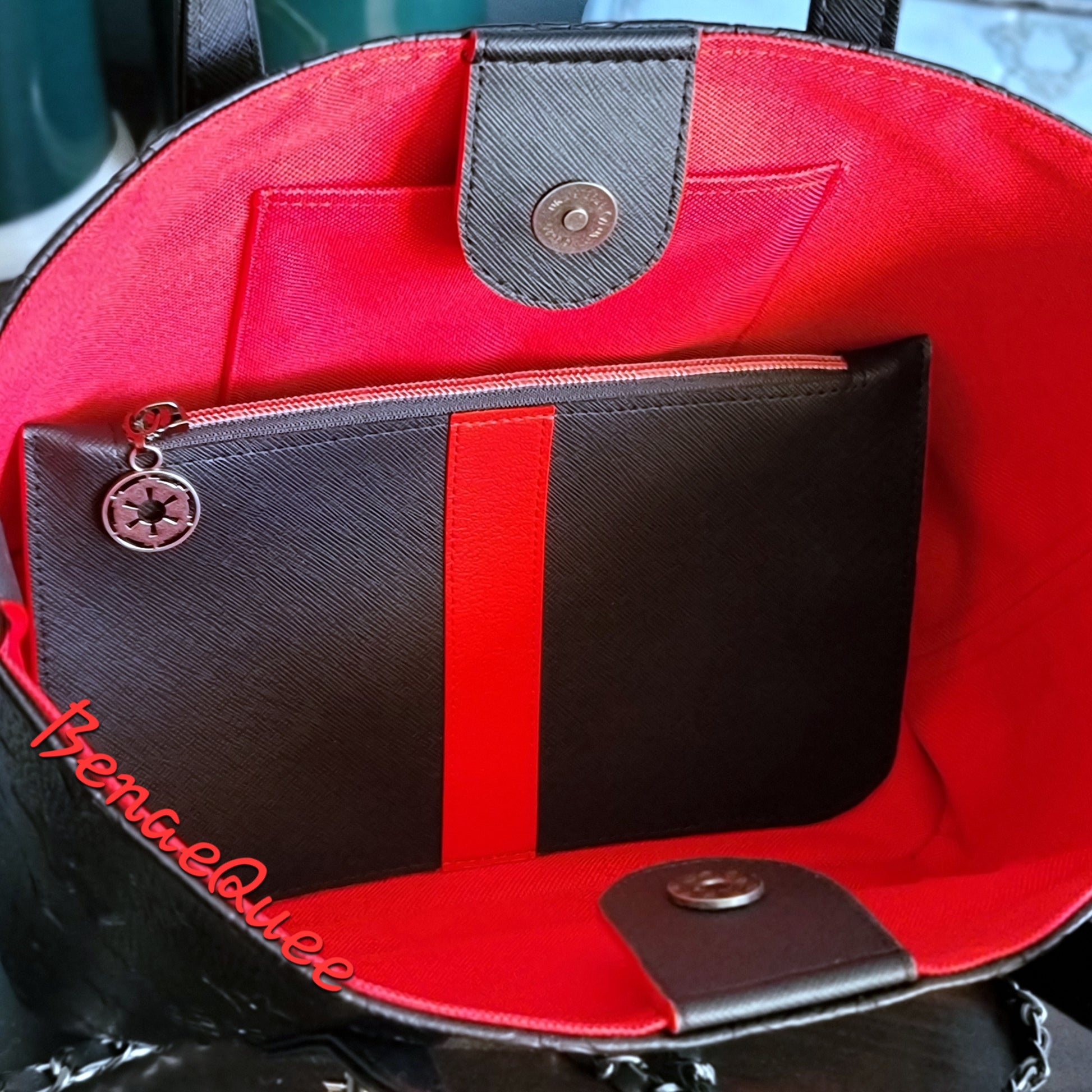 Love fashion, but you also love your fandom? Why not wear your fandom as fashion!? This mini tote purse was a pattern that I designed, inspired by a certain luxury brand's larger tote bag (which I've also made). The debossed and textured vinyl looks so luxurious in black on black.