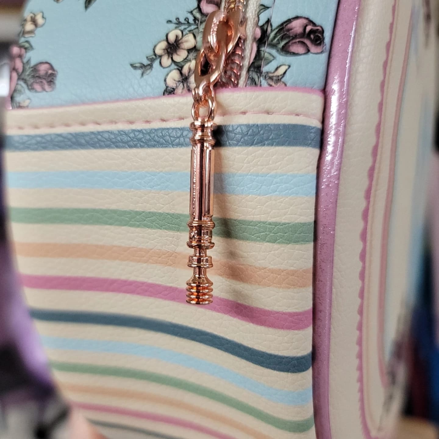 Spring is here for a lot of us, and this bag is absolutely perfect for it! Roses and Rebels come together with a rosey pink glitter vinyl for the piping, and rose gold hardware! You can choose to display the rebel on one side, or the Falcon on the other! Rose gold rebel screws on the handle connector, and a Leia hilt help finish off the details of this bag. Inside the bag there is a slip pocket for your phone and it's lined in waterproof canvas.